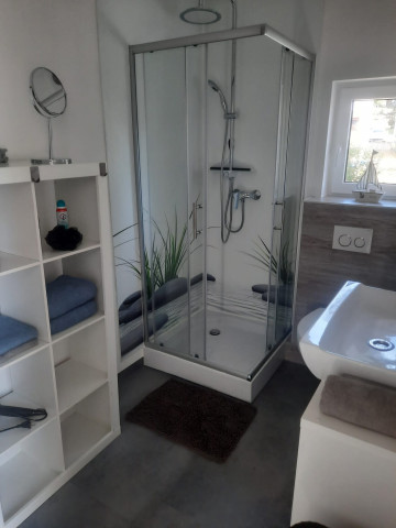 Das Tageslichtbad ist mit einer modernen Dusche, Toilette und Waschbecken ausgestattet.